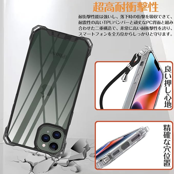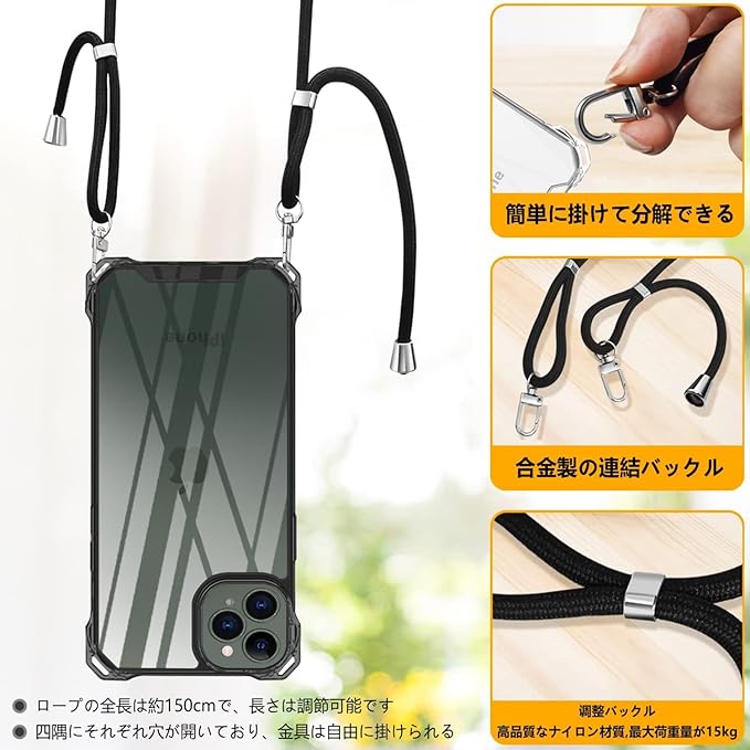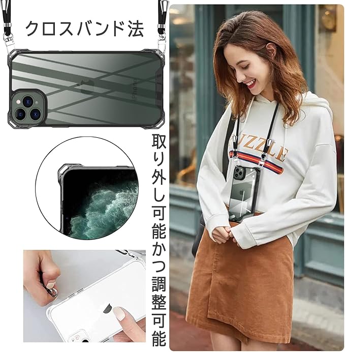 iPhone 11 Pro Max ケース クリア PC ショルダー 軽量 耐衝撃 カバー アイフォン11 Pro Max ケース 透明 薄型 軽量 PC背面 + TPUバンパー 二層構造 携帯ケース 首掛け 肩掛け 斜めかけ 縄掛けケース ストラップ付き 1.5M 取り外し可能 縦/横 2WAY 衝撃吸収 ワイヤレス充電対応 (ブラック)