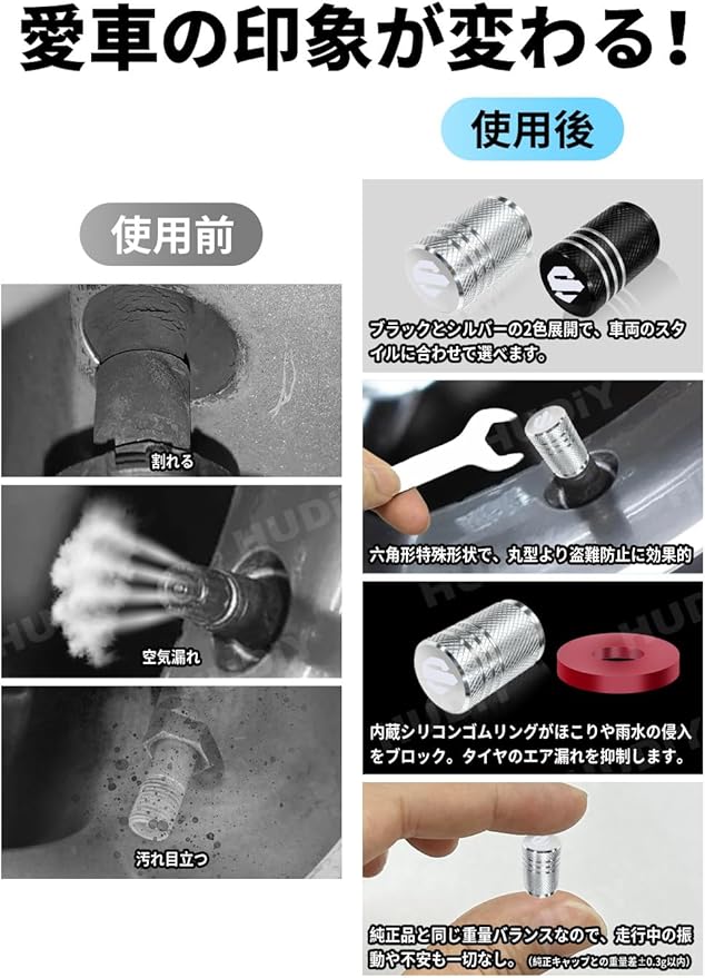 【製品特徴】1. 専用の車両ロゴデザインで、車体全体との完璧な調和を実現。2. 優れた気密構造がエア漏れを効果的に防止し、タイヤ内の空圧を安定維持。3. 走行安全性を高め、タイヤの寿命を延ばし、エア漏れリスクを低減します。4. 愛車の魅力を引き立て、ご自身のこだわりを表現できるとともに、車両全体のグレードを印象付けます。