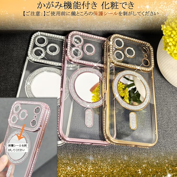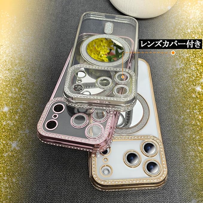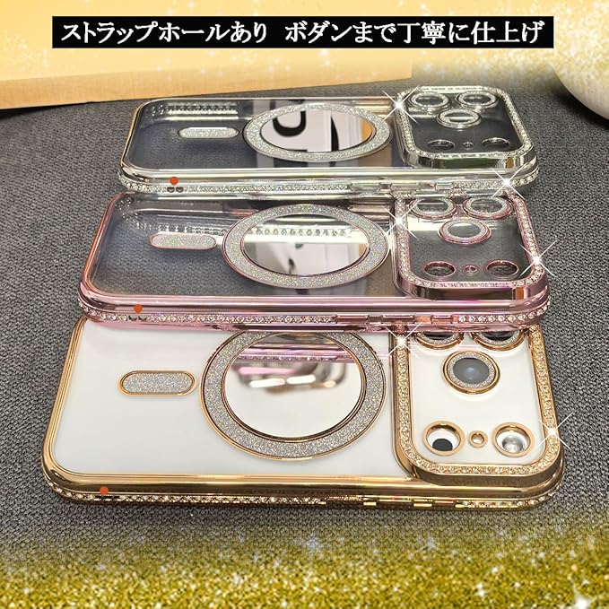 YUYIB スマホケース 対応 MagSafe対応 クリアケース 透明 メッキ加工 ドリル きらきら ブリンブリン かわいい ストラップ穴あり おしゃれ 軽量 薄型 衝撃吸収 女性 携帯電話カバー