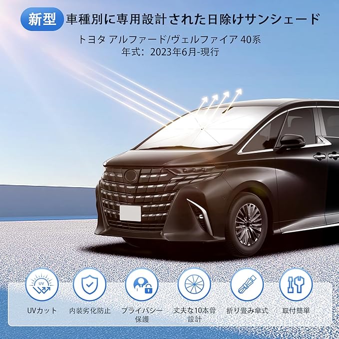 新型 アルファード ヴェルファイア 40系 専用 傘型サンシェード 車種専用設計 360 回転可能 遮光 断熱UVカット フロントガラス用 10本骨グラスファイバー ワンタッチ収納 取付簡単 収納袋付き(ALPHARD VELLFIRE 40系 2023年6月-現行対応)