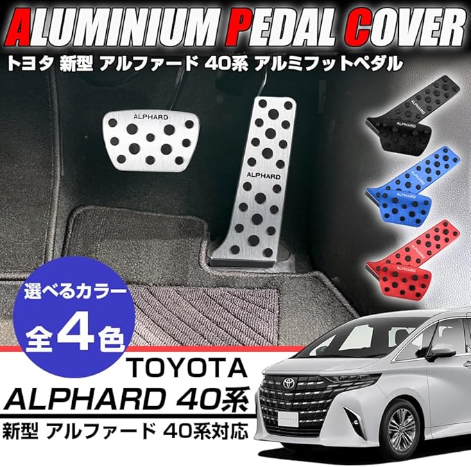 新型 アルファード 40系に適合します。車種専用設計のためフィット感良好、ドライブを快適にするアイテムです。純正ペダルの使用には影響ありません。