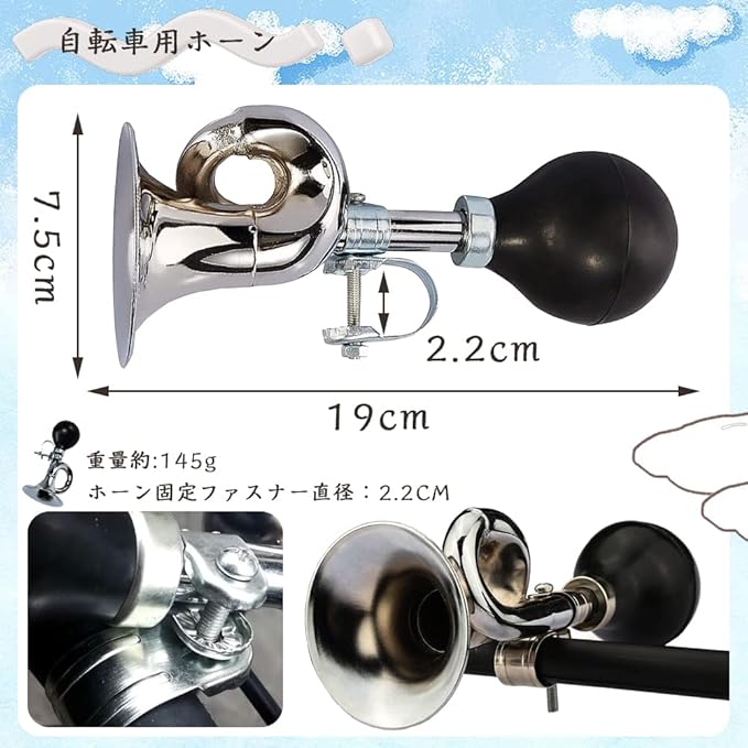 セット内容:自転車用ホーン1個セット 重量約:145g サイズ:全長19cm、ベルの直径7.5cm、ベルクリップの内径2.2cm(直径22mmまでのハンドルバーに対応)