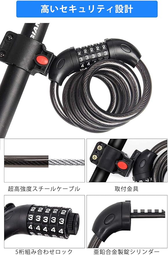 [5桁パスワードロック付き]自転車鍵は5桁パスワードロックを使用し、100,000種類以上のパスワードの組み合わせがあり、従来の4桁パスワードロックの10倍の安全性があります。鍵を紛失して自転車の鍵を開けることができなくなる心配がなくなり、いつでもどこでも安心して移動できます。