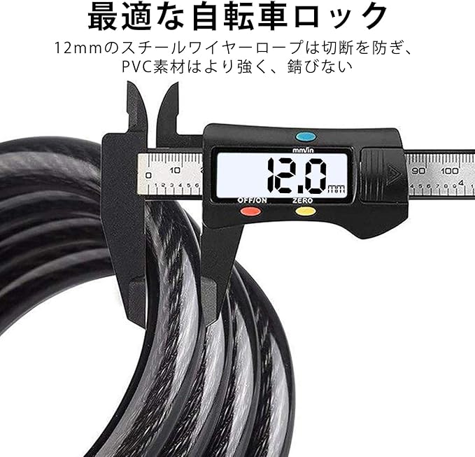 [12mmワイヤーロープ 防護アップグレード]自転車鍵ワイヤーロープは先進的な技術で作られ、12mmの太いワイヤーロープを採用し、強度は伝統的な合金の3倍。自転車ワイヤーロック外身は多層PVC材質で包まれ、頑丈で厚い。製品は高低温と極端な雨雪条件のテストを経て、耐摩耗性と耐錆性が優れており、あなたの私有財産により良い安全保障を提供します。