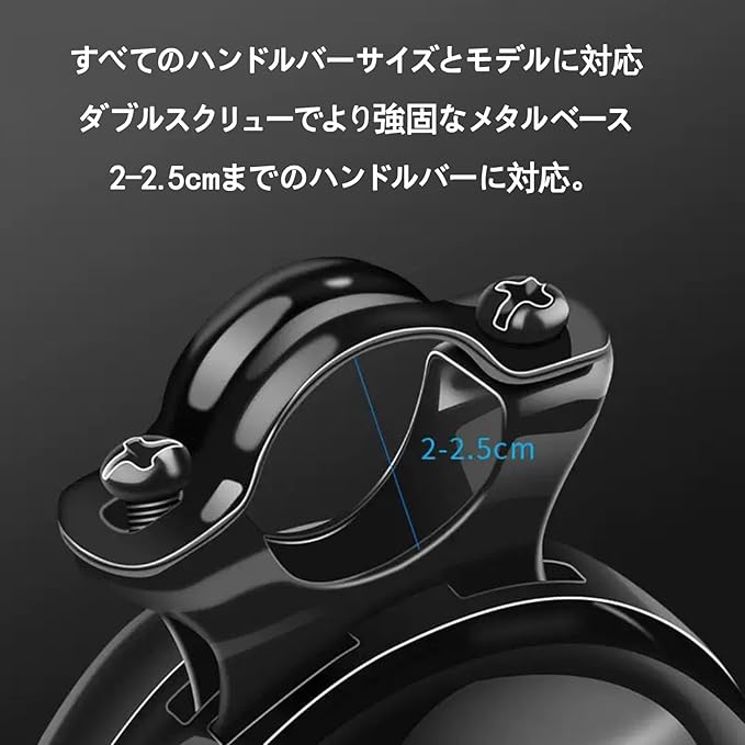 マルチバイク対応クリップ式:ハンドル内径20-25mm(φ22mm標準)に柔軟対応するアジャスタブルバンド。工具不要で10秒装着可能。クロスバイクから折り畳み自転車まで幅広く適合。
