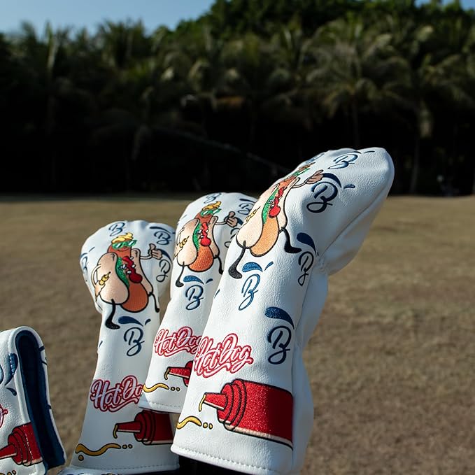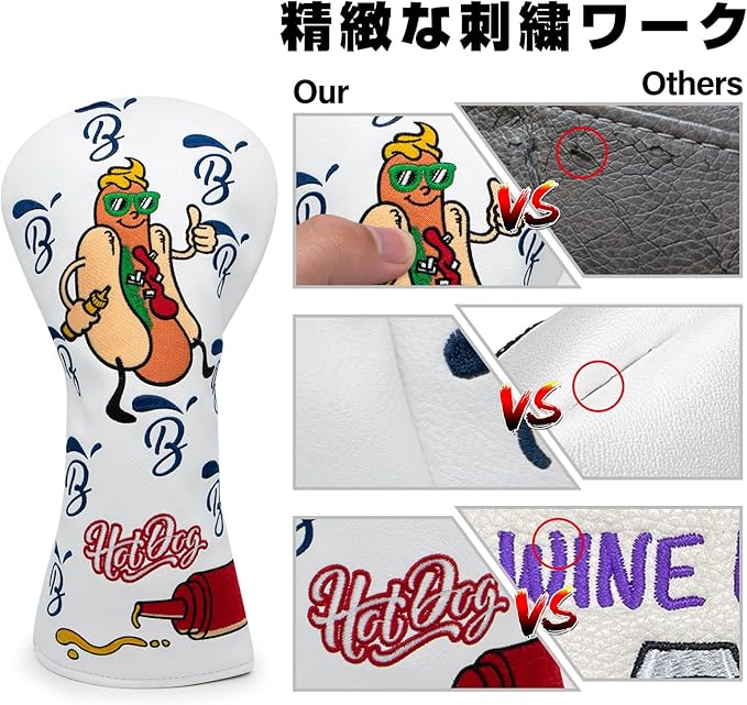 ゴルフクラブヘッドカバー ホットドッグ 刺繍 溢れウッドカバー ドライバー フェアウェイウッド ユーティリティ ハイブリッド用ヘッドカバー 番号タグ付き パターカバーマグネット開閉 ブレードパターカバー
