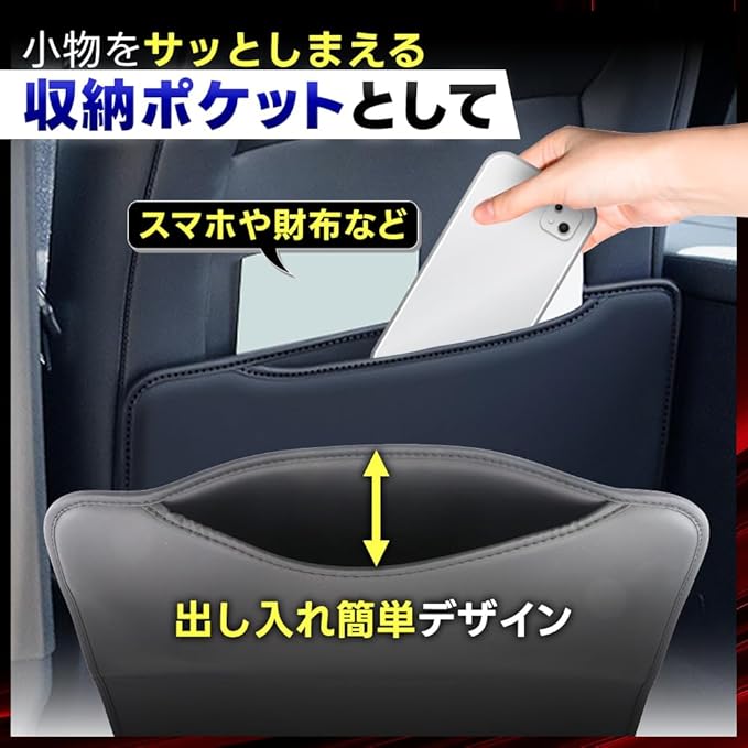 車内に馴染みやすい落ち着いた色味に仕上げているため違和感がありません。キックガードは防汚対策だけでなく収納ポケットとしての機能も果たします。本体上部に切り込みが入っており、スマホ・財布・サングラス・イヤホンなどの紛失しがちな小物の収納に便利です。