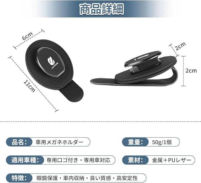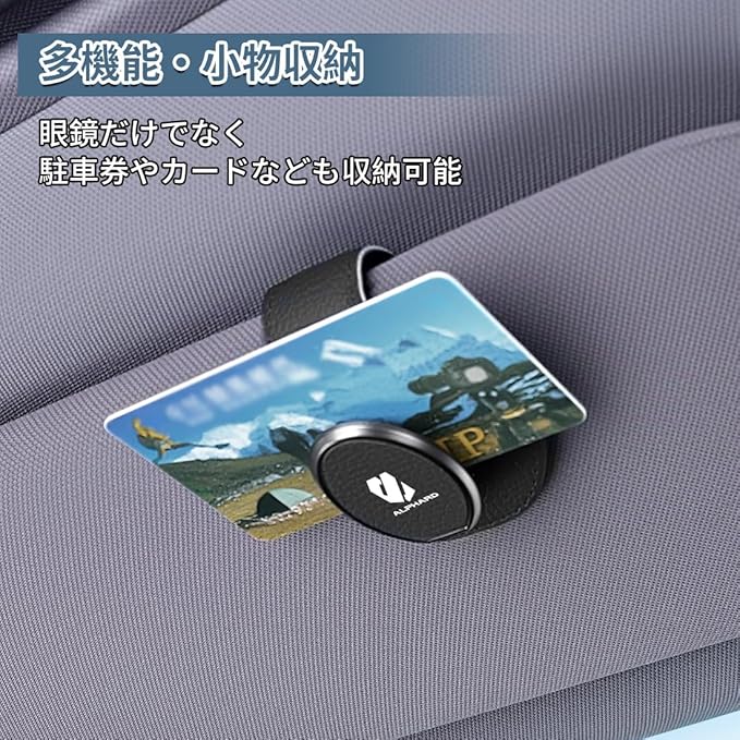 【オシャレな見た目 専用ロゴ付き】この車載メガネホルダーは、金属的な質感とPUレザーのマットな質感が融合し、高級感のあるビジュアルを演出しています。シンプルでありながら、ファッション性も兼ね備えています。さらに、専用ロゴデザインによって、高級感がさらに引き立ちます。美しさと実用性を兼ね備えた便利なアイテムです。適用車種:アルファード 20系 30系 40系
