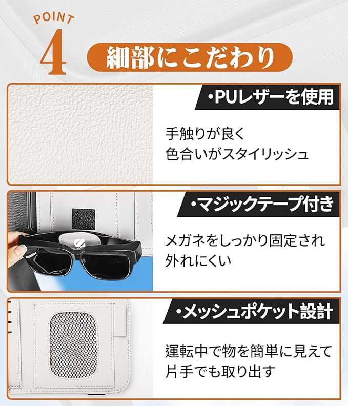 【後方視界確保&落下にくい】サンバイザーポケットはサンバイザーサイズに合わせて設計されます。ドライバ一の安全を最優先に考えて、超薄型デザインで車体に密着し、運転中の視界を一切妨げない確保します。また、強力で安定したマジックテープなので、メガネをしっかりと固定し、物が落下を心配する必要はありません。