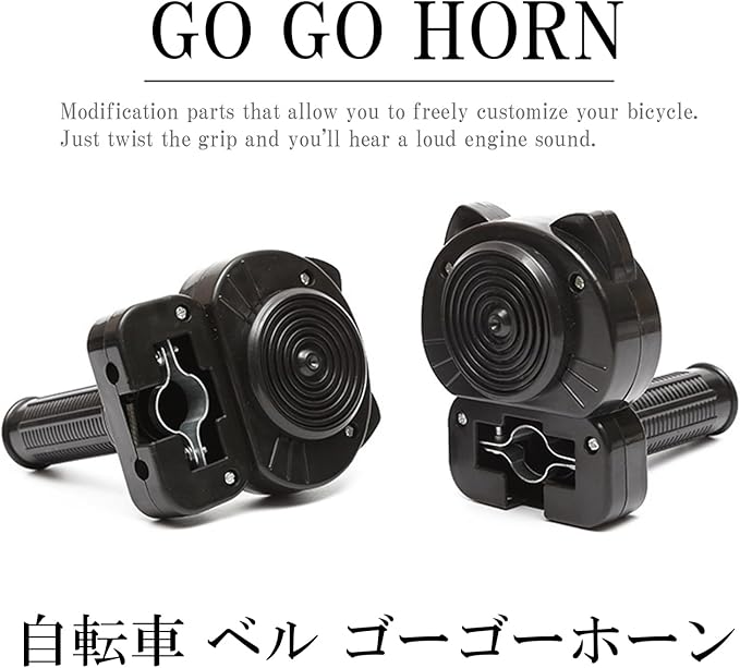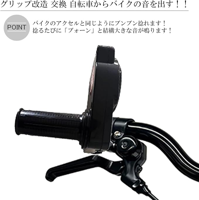 まるでバイク!自転車がエンジン音を響かせる、新感覚のカスタムパーツ! まるでバイクのような音が出るグリップに変身します。このゴーゴーホーンは、グリップをひねるだけで「ブォーン!」というエンジン音が出るバイク風のスロットルが体験できる自転車用カスタムパーツです。自転車のベルとしてだけでなく、遊び心あふれる「面白い(おもしろ)」改造パーツとして、大活躍します。ジョークグッズとしても周りの皆を楽しませます。