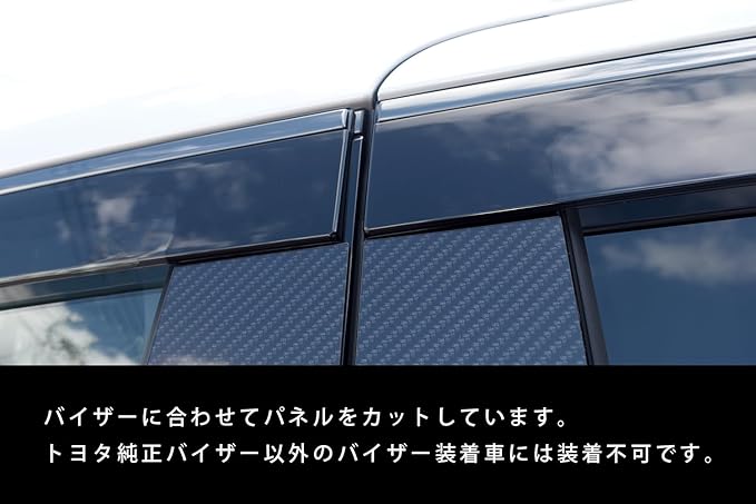 ピラーガーニッシュ左右4パーツ。※バイザー装着車用は「トヨタ純正バイザー(RVワイドタイプ)」に合わせてパネルを設計しております。トヨタ純正用品カタログ内のGRスポーツバイザー/スポーツバイザー、その他市販のバイザーが装着されているお車については装着確認をしていない為、装着不可となります。※トヨタ純正バイザーで形状などに変更が入った場合は、装着が出来ない場合もございます。純正サイドバイザーの取付位置により当製品を装着できない、もしくは写真よりも多く隙間が出ることがあります。両面テープでの装着前に仮当てにてフィッティングと装着位置をご確認下さい。