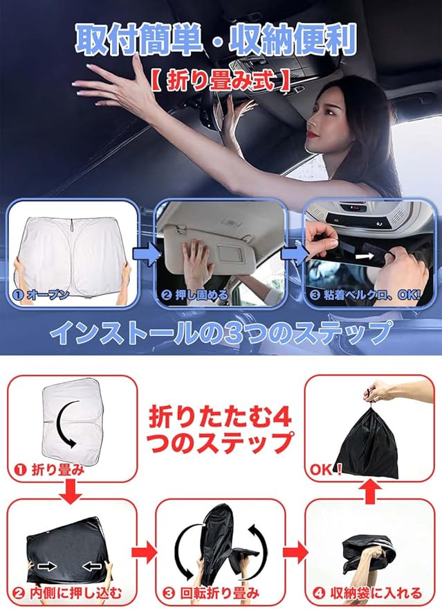 【取り付け簡単】:本製品は吸盤なしタイプのサンシェードです、サンバイザーに挟むだけで取り付けできます。広げるときもワンタッチで、収納時は車のサイドポケットにも収納できるコンパクトさが売りです(収納袋が付いています)。車内の温度上昇抑制にとても効果的で、車内で休憩しても紫外線の心配はありません!