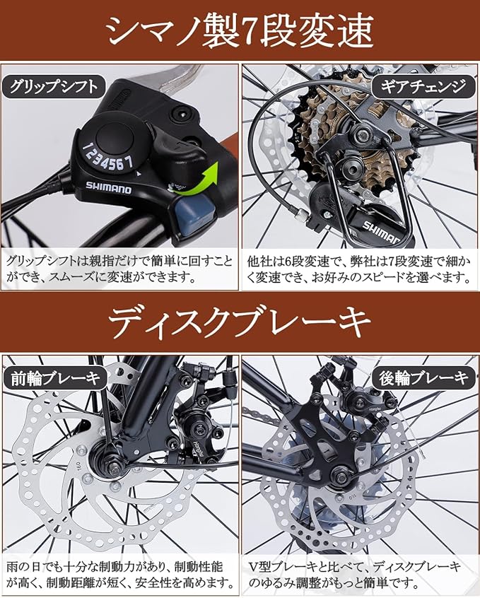 【シマノ製7段変速】世界で最も信頼性のある、SHIMANO社製の7段変速ギアを装備し、右ハンドルにあるサムシフターを切り替えることで、スムーズに変速が出来ます。 なだらかな坂道にも、平坦な市街地にも対応し、様々なライディングシーンにおいて、あなたのニーズに合ったライディングリズムを見つけることができる。