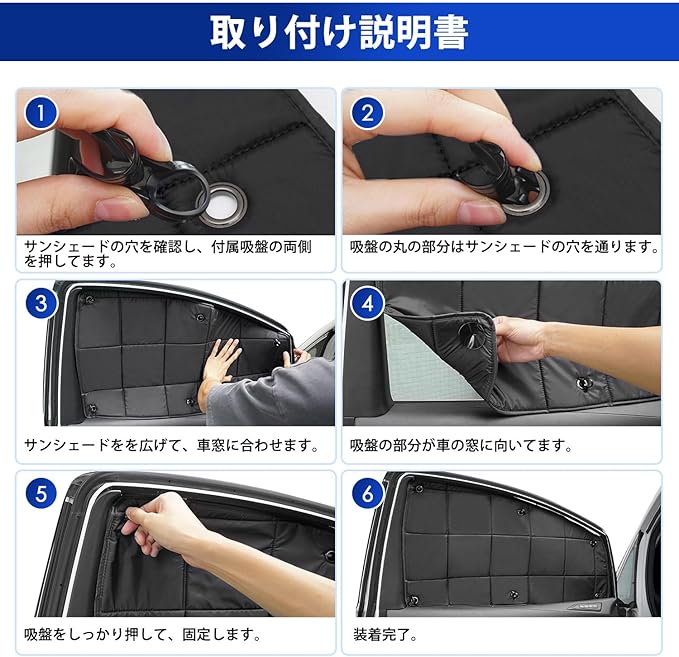 ✔5.【装着簡単・収納便利】吸盤タイプ設計を採用して、即座に取り付け取り外しが可能です。格子状設計ので、商品外観も美しく、シェーディング効果も一流です。車に積みっぱなしでもOK!簡単にコンパクトに収納可能です。(※①取り付ける時、まず窓を清潔にして、それから吸盤を貼り付けます。吸盤を押すことによって、吸盤内部のすべての空気を取り除き、吸盤をより強固に貼り付けます。※②吸盤が変形した後、また吸引しなかった後、60秒間にお湯に浸して仕様を再開してください。)