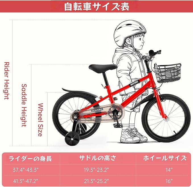 自転車 16インチ、お子様の成長に合わせてサイズを選べます。 ハンドルとサドルの高さを調整できるので、長くご愛用いただけます。 補助輪を外せば、ペダリングの練習も始められます。
