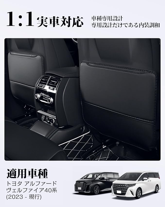 【適合車種】トヨタ アルファード・ヴェルファイア 40系 (2023年6月〜現行)。セット内容:後部座席キックガード 2枚セット。※年式・グレード・オプションにより適合しない場合があるため、事前に形状をご確認の上、お買い求めください。