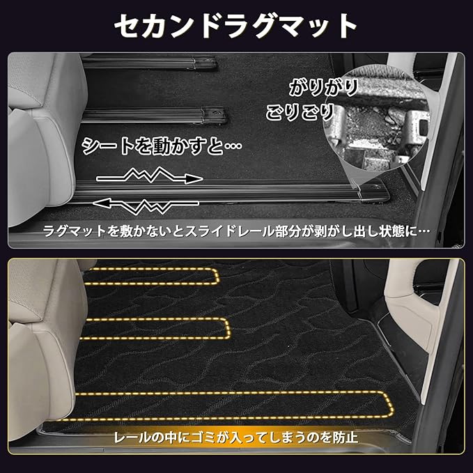 4.「レールが隠れる・汚れ防止」2列目のレールを隠すことができます。レールが隠れると、車内雰囲気が変わります。レールがカバーできうるので、車の床を汚れやギスなどから守ります。子供の食べカス・靴の泥・ほこりなどに困っているお客様におススメ!