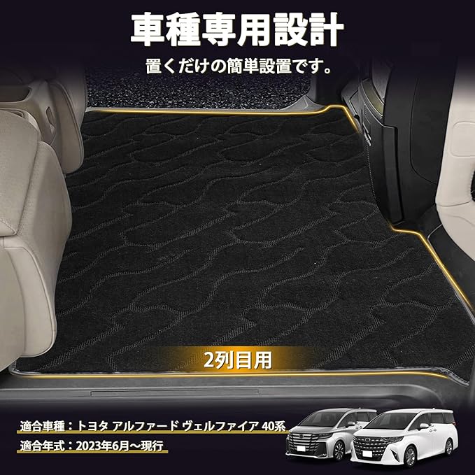 1.「適合車種」:トヨタ アルファード ヴェルファイア 40系 7人乗り・適合型式:AGH45W/AGH40W/AAHH40W/AAHH45W 【全グレードに対応 ※サイドリフトアップ車には不対応】・年式:2023年6月~現行。※ご注意:形状、年式とモデルをご確認頂いた上、お買い求めください。 ・セット内容:セカンドラグマット 1P。(合計1PCSセット)。