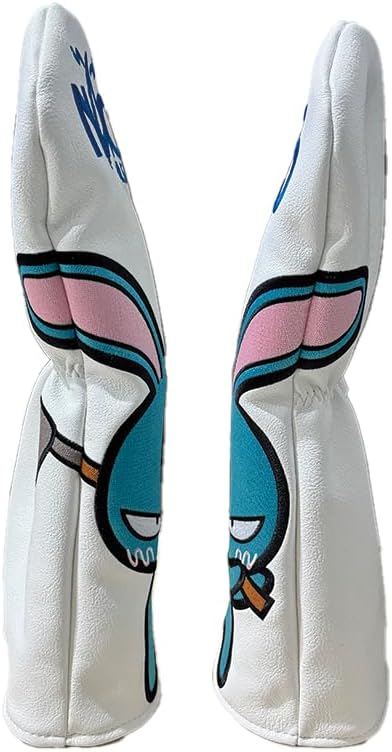 青色のキャラクターがプリントされた白いヘッドカバーです。耳の日(3月3日)生まれのらじっと君は、ときがわ町が出身地です。