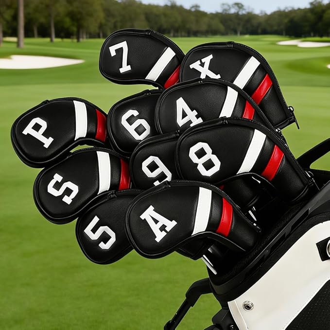 ゴルフアイアンカバー ファスナー開閉 ウェッジカバー ロングネック クラブヘッドカバー セット 10pcs(4-9,P,A,S,X) 合成皮革 黒い 赤い 白い