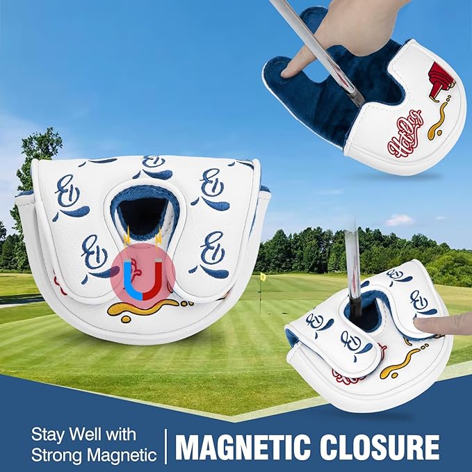 【超強力なマグネット留め具】:ゴルフパターヘッドカバーは超強力なマグネット留め具を採用しています。ゴルフクラブパターカバーはクラブから外れにくく、落下の心配がありません。着脱も簡単です。