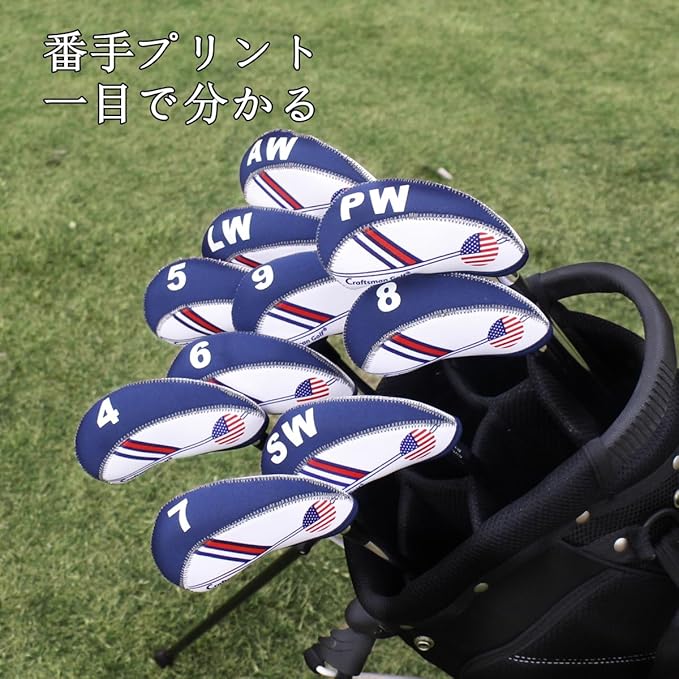 CRAFTSMAN(クラフトマン)ゴルフアイアンカバー クラブヘッドカバー 10枚セット (4-9,PW,AW,SW,LW) ネオプレン製 伸縮性ある アメリカフラグ柄 ホワイト ブルー