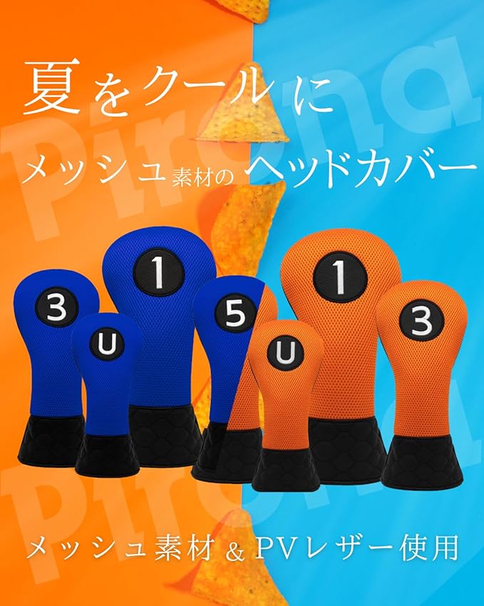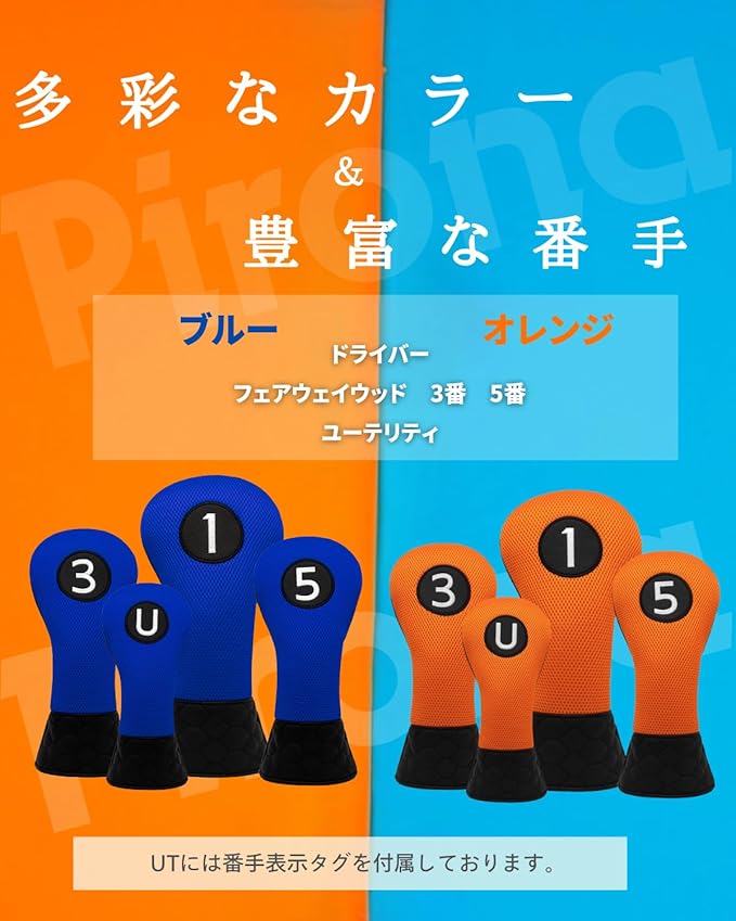 【選べる2カラー】 ゴルフクラブヘッドカバー PUレザー&メッシュ素材使用 オレンジ ブルー ドライバー・フェアウェイウッド・ユーティリティーに対応 UTに番手表示タグ付き(#2~#6, UT)