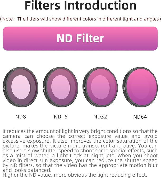 NDフィルターは、画像の露出オーバーを回避し、画像の色彩度を高め、画像をより透明で鮮やかにします。 NDフィルターと調光器は、霧が流れる水や夜間のライトトラックなど、遅いシャッタースピードで特殊効果を捉えることができます。