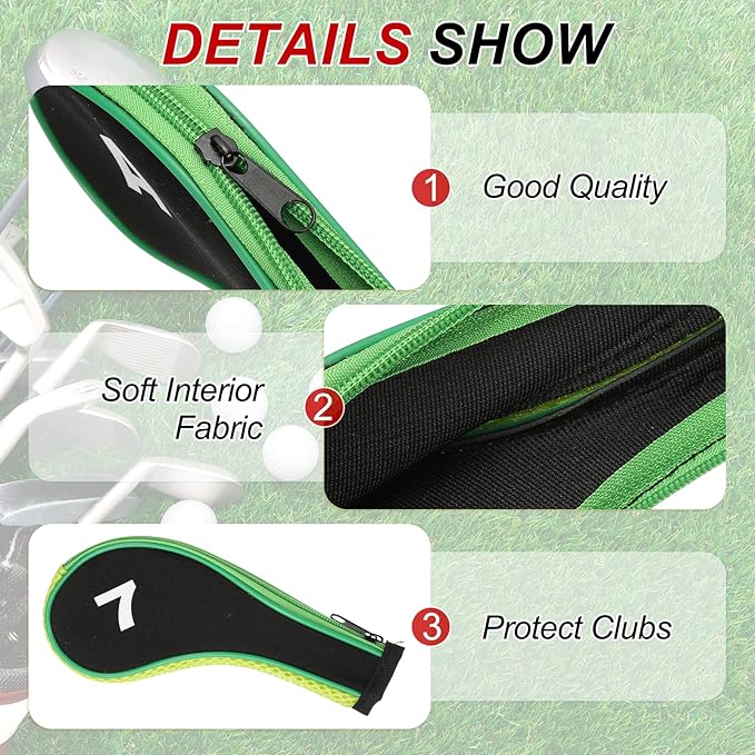 カラー:黒/緑; 素材:ネオプレン/ナイロン; 全体サイズ:190 x 85 mm / 7.48 x 3.35 インチ (長さ x 幅); 穴の長さ:30 mm / 1.18 インチ; 内容物:ゴルフクラブヘッドカバー12個