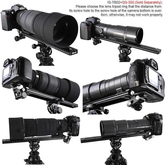 3.ロングフォーカスレンズとカメラ本体の間に取り付け、カメラマウントの重量を分担してロングフォーカスを保護するiShootクイックリリースプレートQS-120、QS-220、またはQS-350(別売)と併用できます レンズとカメラは損傷からマウントされますが、安定性も向上します。