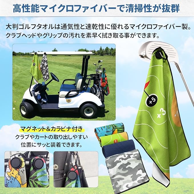✅【高性能マイクロファイバーで清掃性が抜群】ゴルフタオルは通気性と速乾性に優れるマイクロファイバー製。さらにマグネット&カラビナ付きなので、クラブやカートの取り出しやすい位置にサッと装着でき、クラブヘッドやグリップの汚れを素早く拭き取る事ができます。