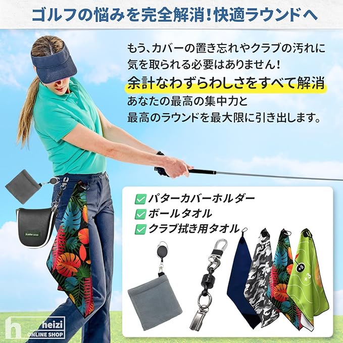 heizi ゴルフタオル クラブ拭き パターカバーホルダー 【快適ラウンド3点セット】 クラブタオル パターカバー紛失防止 コンペ 景品 ゴルフ便利グッズ