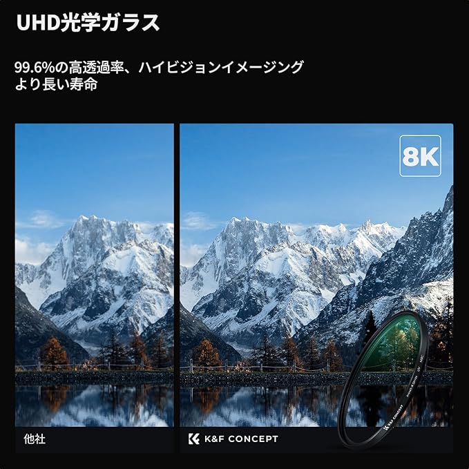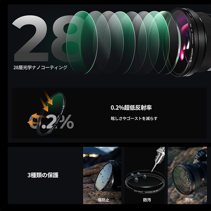 【低反射率 高透過率 高解像度】光学ガラスを採用し、レンズの色特性に影響を与えないMCレンズガードと、UV(紫外線)をカットするMCUVタイプフィルターです。MCとはマルチコートの略で、レンズ表面に反射防止膜を蒸着し、余計な反射光を抑えます。28層コーティングを行うため、99.6%という高い透過率を誇ります。フィルターの枠はアルミ合金製、軽くて、枠の厚さが薄く作られており、ケラレの心配が少ないため、広角レンズに最適なレンズフィルターです。プロ仕様の高精度なレンズ保護フィルターです。
