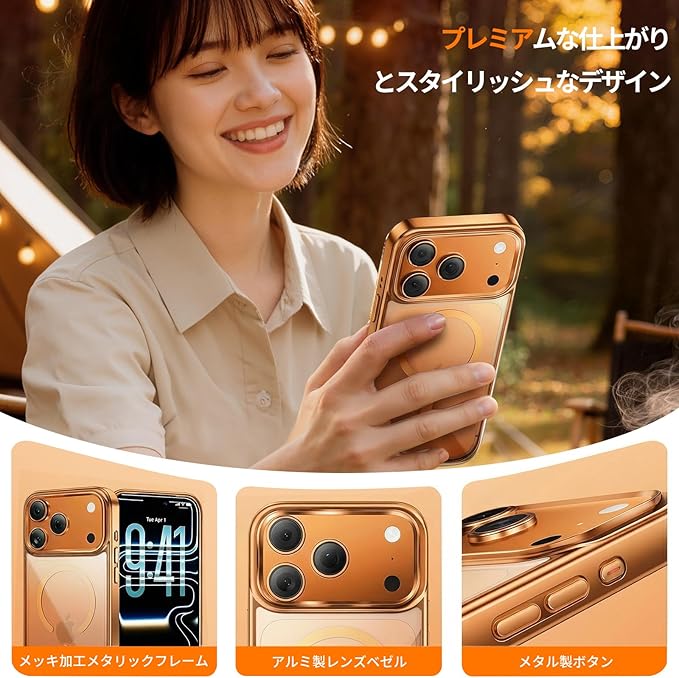 ✨ 高級感あふれるスタイリッシュな仕上がり メッキ加工されたメタリックフレーム、アルミ製レンズベゼル、滑らかな金属ボタンが、洗練された高級感を演出。 iphone 17 プロマックス ケースとして、iPhone 17 Pro Max のデザインを引き立てます。 耐傷性・防汚コーティングで指紋がつきにくく、オフィス・アウトドア・お出かけなどシーンを選ばず美しい見た目をキープ。 iphone 17 Pro Max クリアケースながら強力な保護力を備え、デザインと機能を両立します。