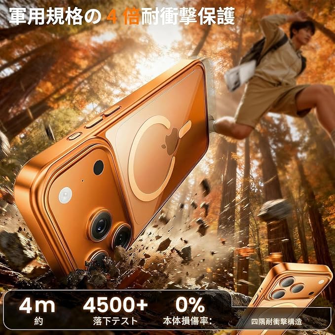 ️4倍米軍規格の耐衝撃性能 当製品は 4倍米軍規格 (MIL 規格) 認証を取得。 約 4m の高さからの落下試験をクリアし、4,500 回以上の落下テストで端末にダメージゼロを実現しています。 四隅のiphone17 Pro Max ケース 衝撃吸収構造と補強されたメッキフレームが衝撃を分散。 アウトドアやスポーツ時、お子様がいる場面でも画面の割れやカメラの凹みを心配する必要がありません。 厚ぼったくならず、い phone17 Pro Max ケース 薄型ながら強力に守ります。