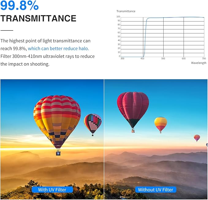 【ナノコーティング】多層UV フィルターは 30 層光学コーティングと最大 99.8% の光透過率 (最小光反射率 0.1% 未満) を特徴とします。300nm から 410nm までの範囲の紫外線を遮断し、フレアを低減し、正確な色表現を確保しながら再現します。コーティングは帯電防止、耐油性、撥水性、耐スクラッチ性も備えています。