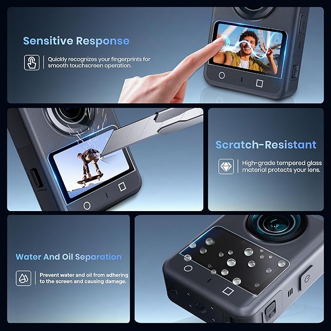 【簡単取り付け】保護フィルムは360度カメラの画面にぴったりフィットし、取り付けも簡単で、カメラの画面に素早く簡単に貼り付けられます。気泡が入りにくい設計で、初心者にも最適です。レンズカバーも簡単にカメラに装着できます。
