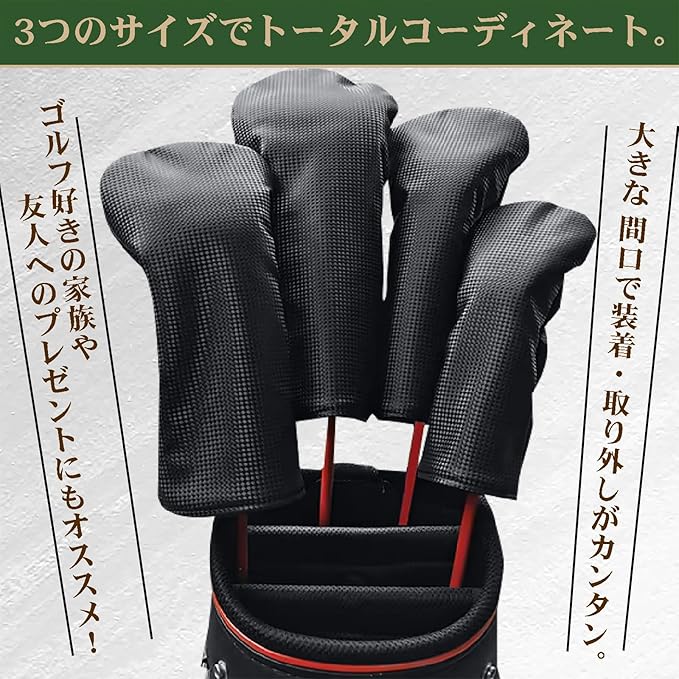大きな 間口で装着・取り外しがカンタン。 ドライバー用、フェアウェイウッド用、アイアン等のユーティリティ用の3種類のサイズがあり、 すべてのサイズを揃えればカバーをトータルコーディネートする事も可能。