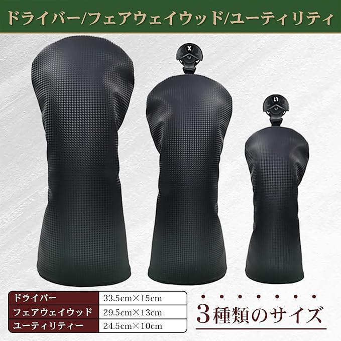 高品質で柔らかなPVCレザー素材を使用。 高級感のあるデザインと滑らかな手触りを実現。 バリエーション:ドライバー単品、フェアウェイウッド単品、 ユーティリティー単品 フルセット(ドライバー1個・フェアウェイウッド2個・ユーティリティー1個の4個セット) 各種に色のバリエーションがあります:白レザー調・黒レザー調・カーボン調