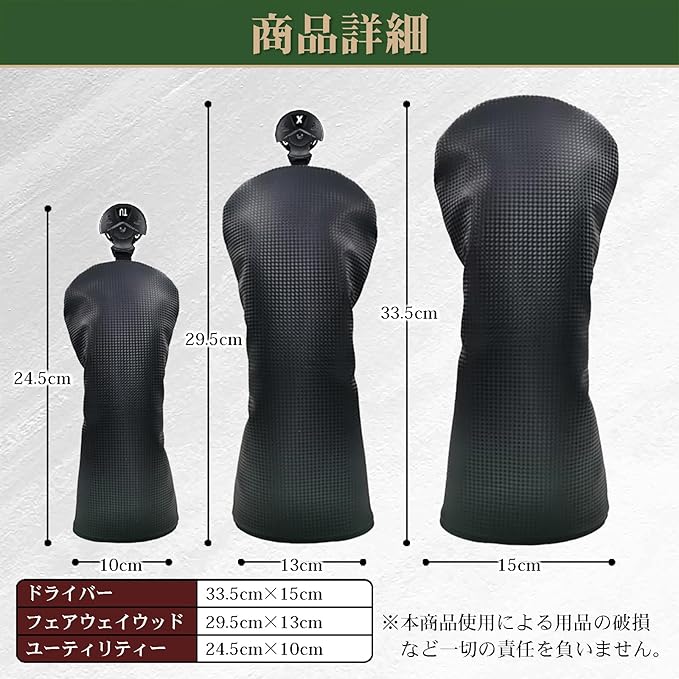 ※本商品使用による用品の破損など一切の責任を負いません。 サイズ(外寸 cm) ドライバー:33.5cm 15cm フェアウェイウッド:29.5cm 13cm ユーティリティー:24.5cm 10cm" "ドライバー