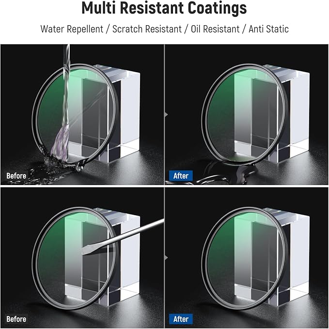 【両面マルチコーティング】両面24層のナノメートルコーティングは、帯電防止、耐油、防水、耐傷性があり、反射やレンズのぎらつきを最小限に抑えて鮮明な画像を実現します。