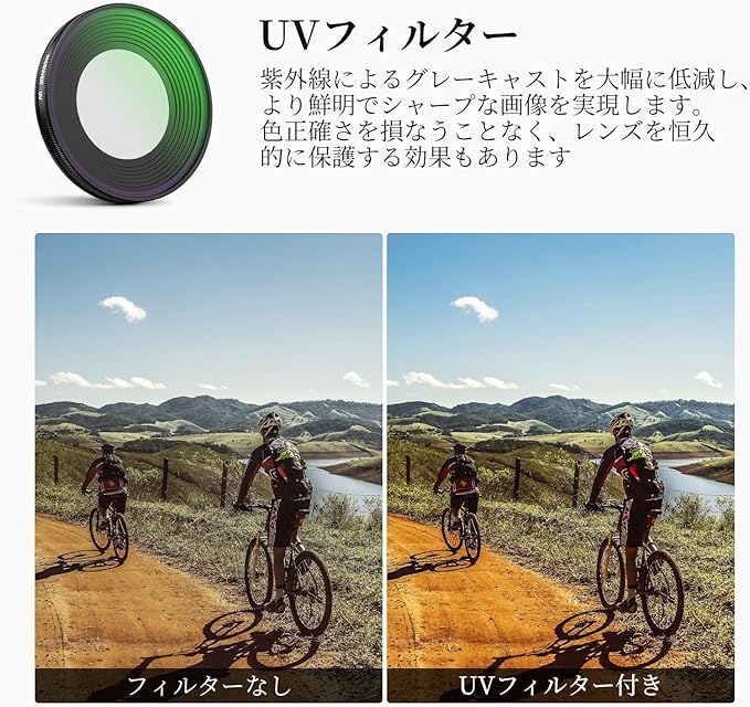 【曇り&紫外線を除去】UVフィルターは、色精度に影響を与えることなく曇りや紫外線を遮断し、カメラレンズを保護します。