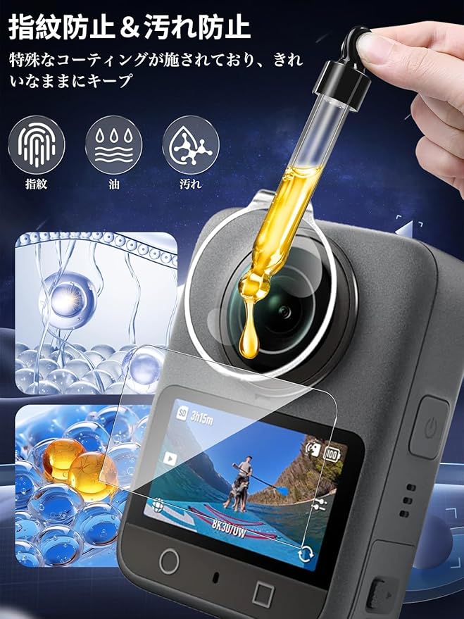 【特殊コーティング加工】保護フィルムは先端コ一ティングにより撥水撥油と指紋防止機能があり、長い時間カメラを使っても液晶画面がスムーズなタッチ感を保てます。手汗・水滴・油汚れなどが付着しにくいですので、爽やかな手触り感ができます。
