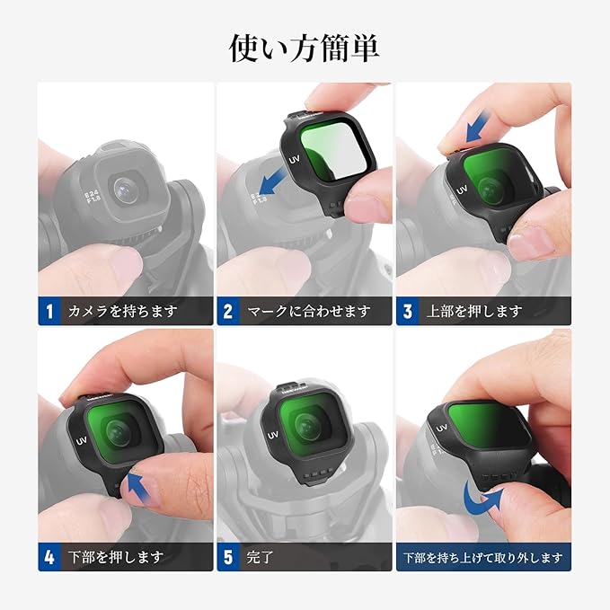 【クイックスナップオンアタッチメント】カメラを持ち、フィルターの位置を調整可能で、上から下までしっかりと固定されるまでカチッとはめ込みます。わずか1g軽量フレームがジンバルのバランスと正確さを維持します。