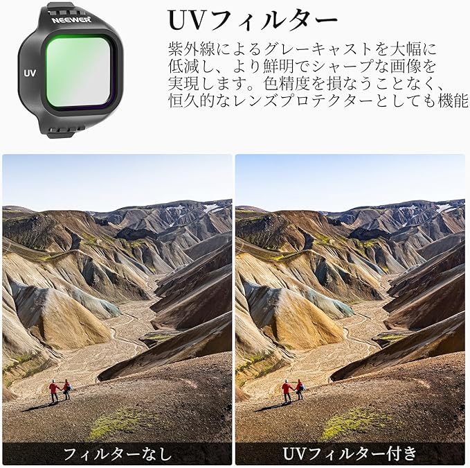 【ヘイズ&紫外線を抑制】UVフィルターはヘイズを効果的に除去し、紫外線を遮断することでカメラレンズを保護します。色精度を損なうことなく恒久的なレンズプロテクターとしても機能します。