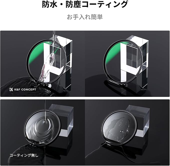 【撥水防汚加工&カビ止め】撥水(WPC)加工、軽く拭くだけで簡単に水滴が消え去ってくれます。指紋がつきにくく、汚れても簡単に拭き取れます。貴重なレンズをしっかり守る保護フィルターです。