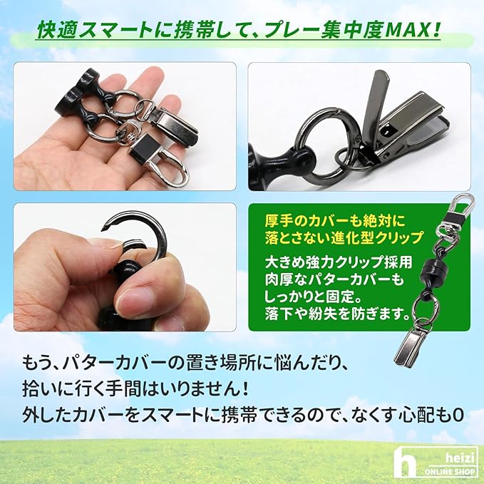 ✅【厚手のカバーも絶対に落とさない進化型クリップ】大きめの強力クリップを採用することで、肉厚なパターカバーもしっかりと固定。大切なカバーの落下や紛失の不安から完全に解放し、安心感を提供します。