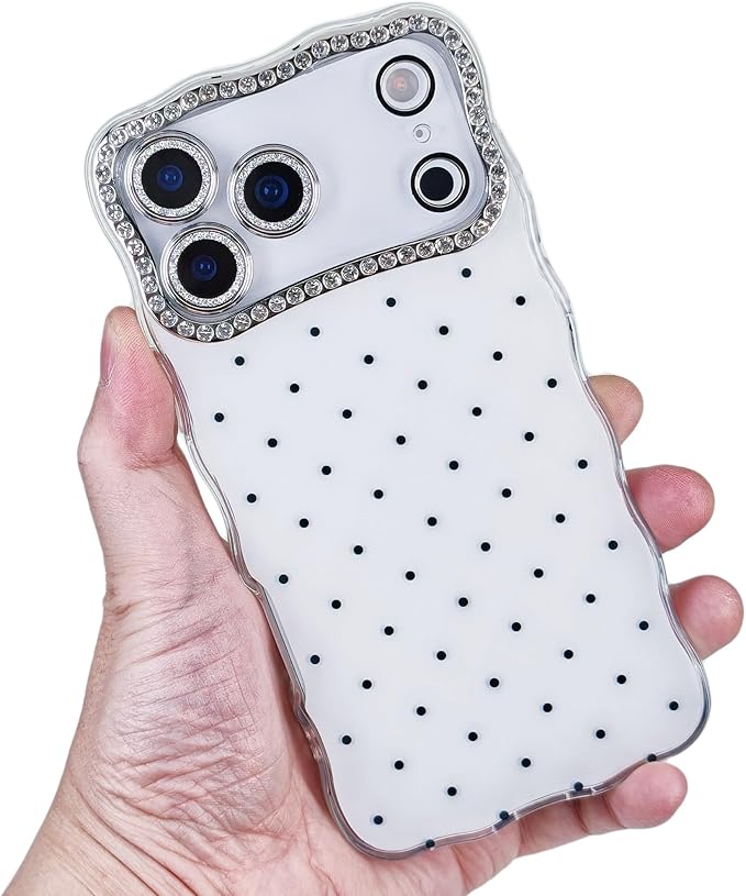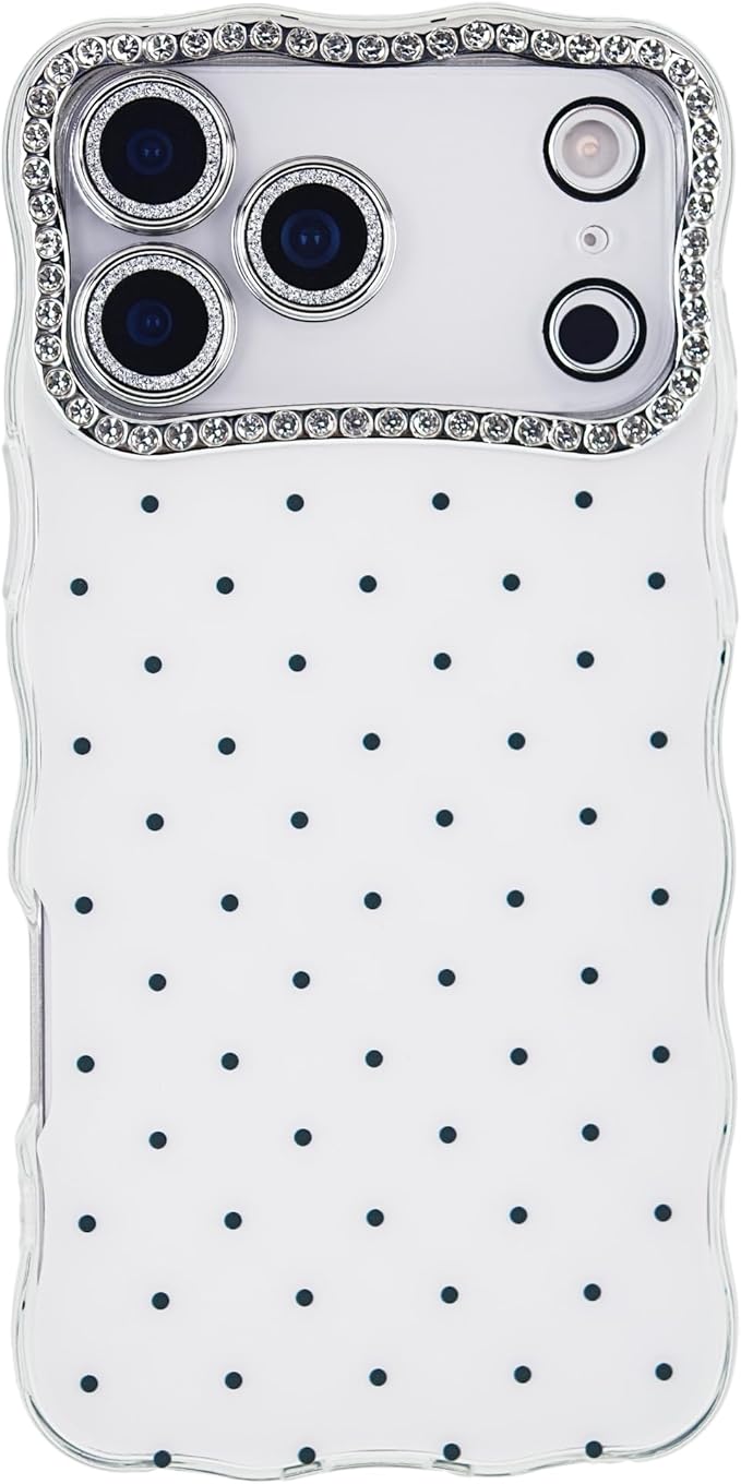 iPhone17 Pro対応ケース、かわいいポルカドットデザイン、取り外し可能なダイヤモンドカメラレンズガラスプロテクター、6.3'' - 白