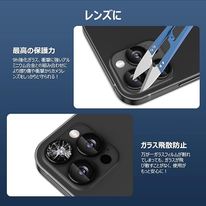 【対応機種】iPhone 15 Pro /iPhone 15 Pro Max専用レンズカバー。素材:アルミ合金 +日本旭硝子製・ 9H強化ガラス・傷がつきにくい