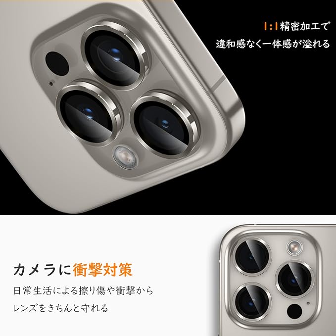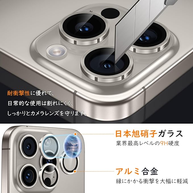 【耐衝撃・保護力満点】9H硬度ガラスと耐摩耗性に優れた航空用アルミ合金を上手く組み合わせたカメラカバーは衝撃を効果的に吸収し、衝撃を最小限に抑えられます。鍵やカッターなどの鋭利な物を当てても無傷で済む!さらに、特殊な飛散防止設計により、万が一ガラスが割れても飛散せず、高い安全性を確保します。